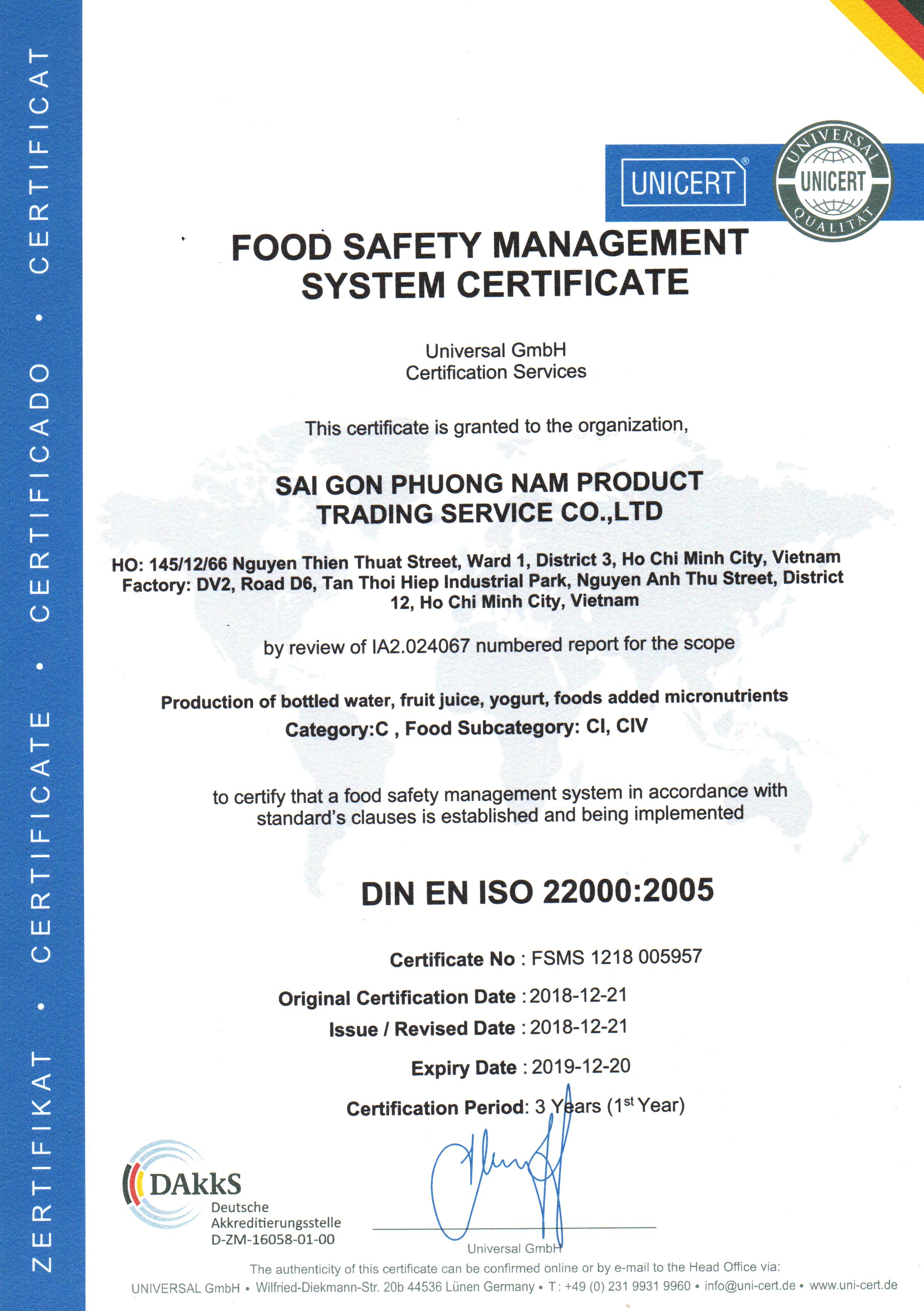 - Chứng nhận Hệ Thống Quản Lý An Toàn Thực Phẩm (ISO 22000:2005) được cấp cho Công ty TNHH SX TM DV Sài Gòn Phương Nam