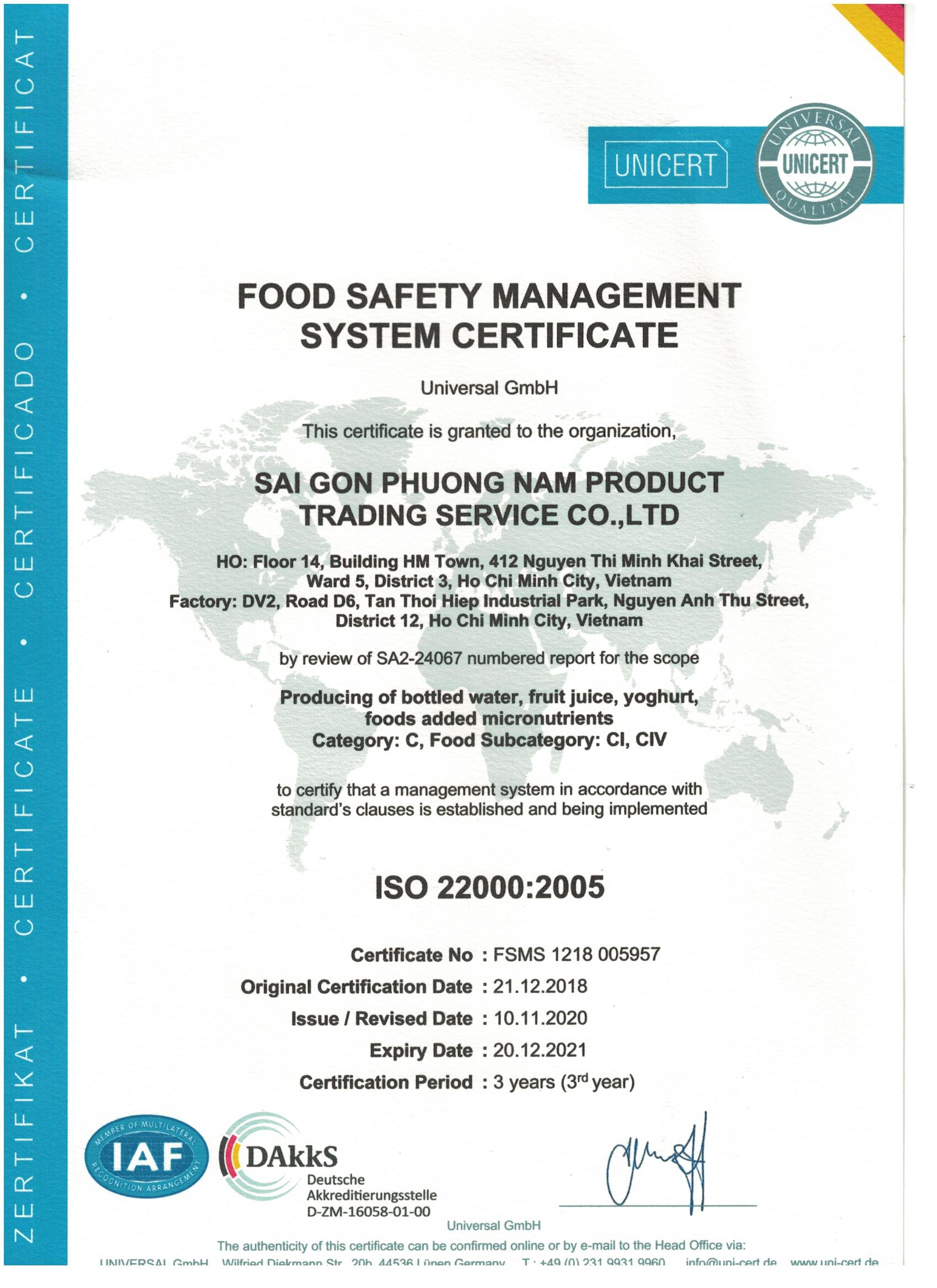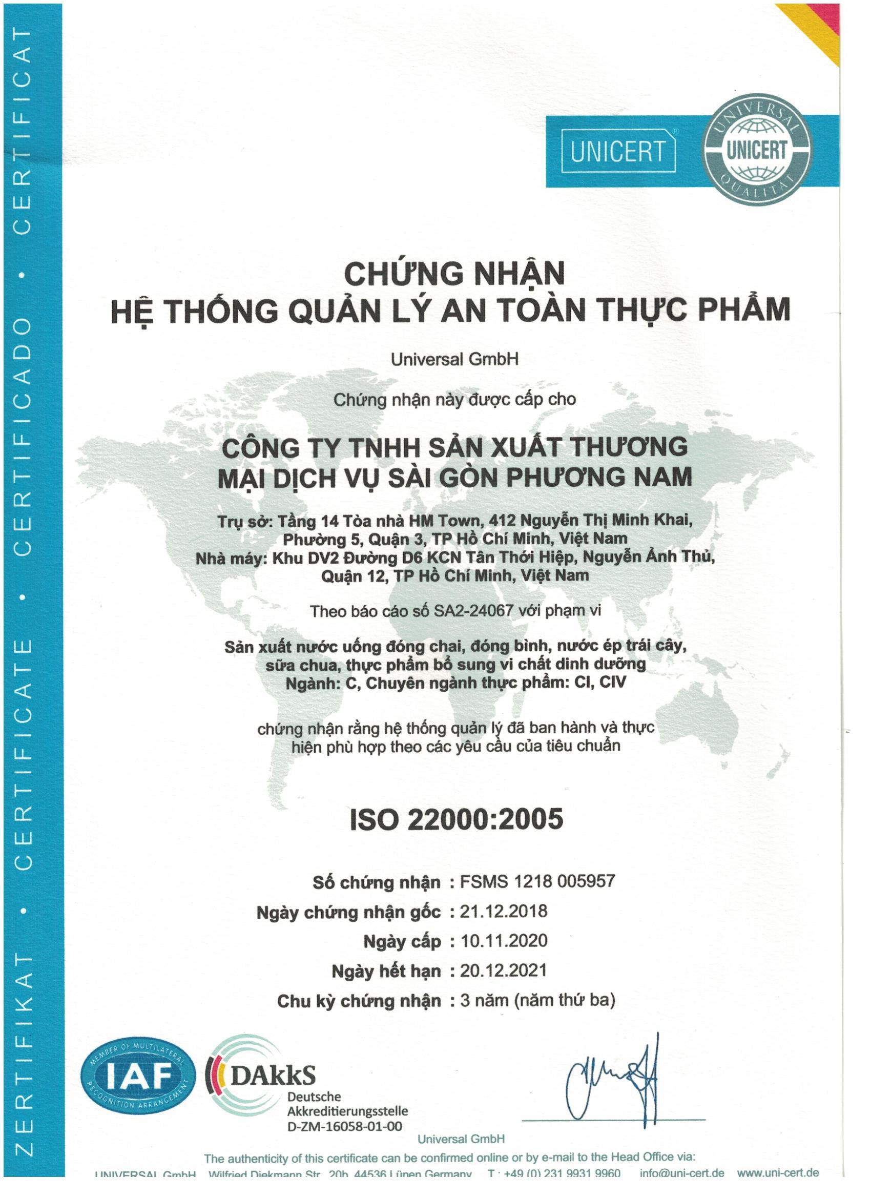 - Chứng nhận Hệ Thống Quản Lý An Toàn Thực Phẩm (ISO 22000:2005) được cấp cho Công ty TNHH SX TM DV Sài Gòn Phương Nam